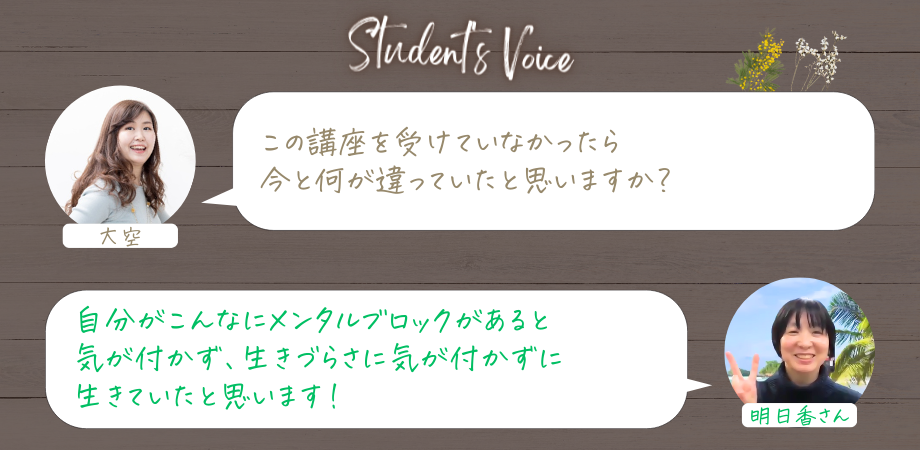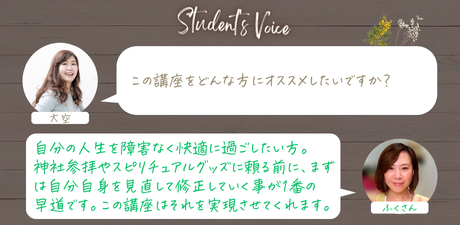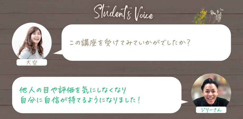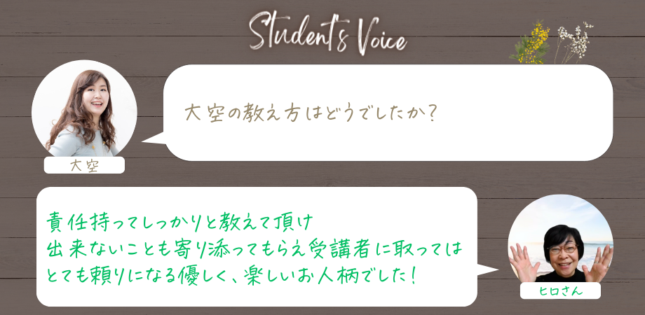 以下はセッションを受け、効果を実感いただき、実際に自分でもできるようになりたいと講座を受けていただいた生徒さんの声です。